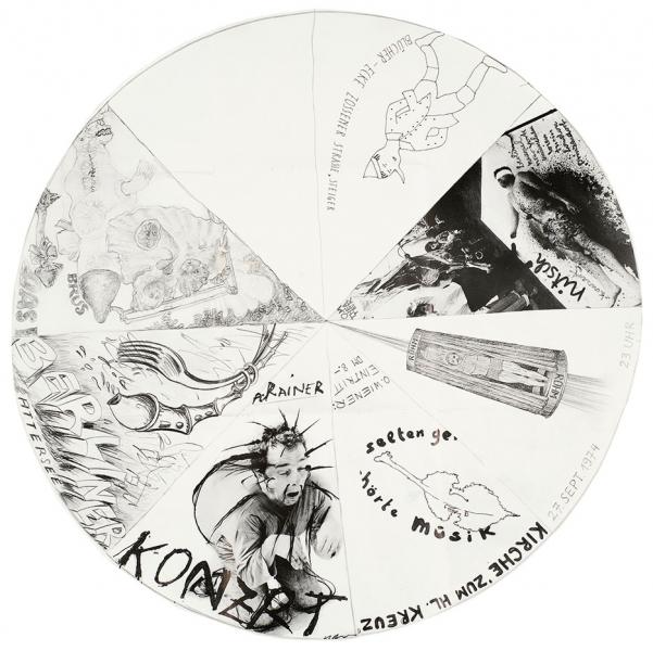 Wiener Lieder und Gemischte Weisen, 1979. Entwurf für LP-Label. Tusche auf Papier, Durchmesser 10 cm
