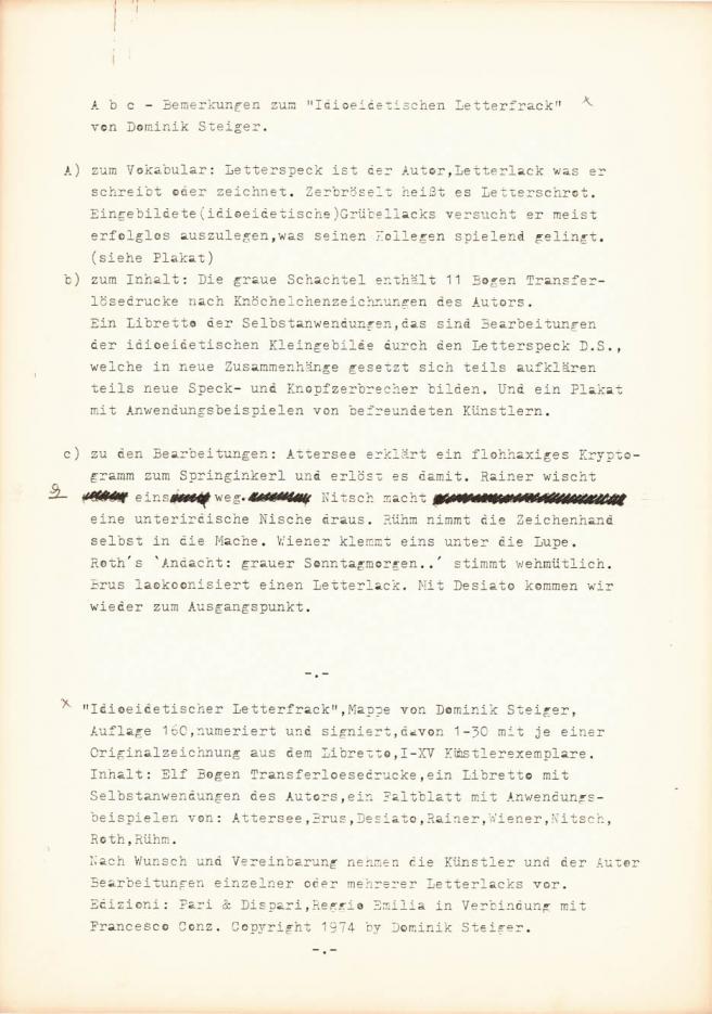 „Idioeidetischer Letterfrack“, Mappe von Dominik Steiger, Auflage 160, numeriert und signiert, davon 1-30 mit einer Originalzeichnung aus dem Libretto, I-XV Künstlerexemplare. Inhalt: Elf Bogen Transferloesedrucke, ein Libretto mit Selbstanwendungen des Autors, ein Faltblatt mit Anwendungsbeispielen von: Attersee, Brus, Desiato, Rainer, Wiener, Nitsch, Roth, Rühm.