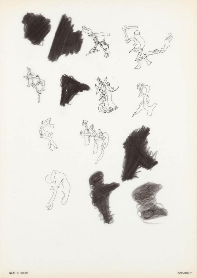 b) zum Inhalt: Die graue Schachtel enthält 11 Bogen Transferlösedrucke nach Knöchelchenzeichnungen des Autors. Ein Libretto der Selbstanwendungen, das sind Bearbeitungen der idioeidetischen Kleingebilde durch den Letterspeck D.S., welche in neue Zusammnehänge gesetzt sich teils aufklären, teils neue Speck- und Knopfzerbrecher bilden. Und ein Plakat mit Anwendungsbeispielen von befreundeten Künstlern.