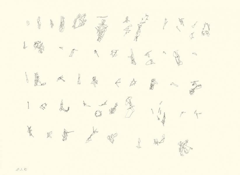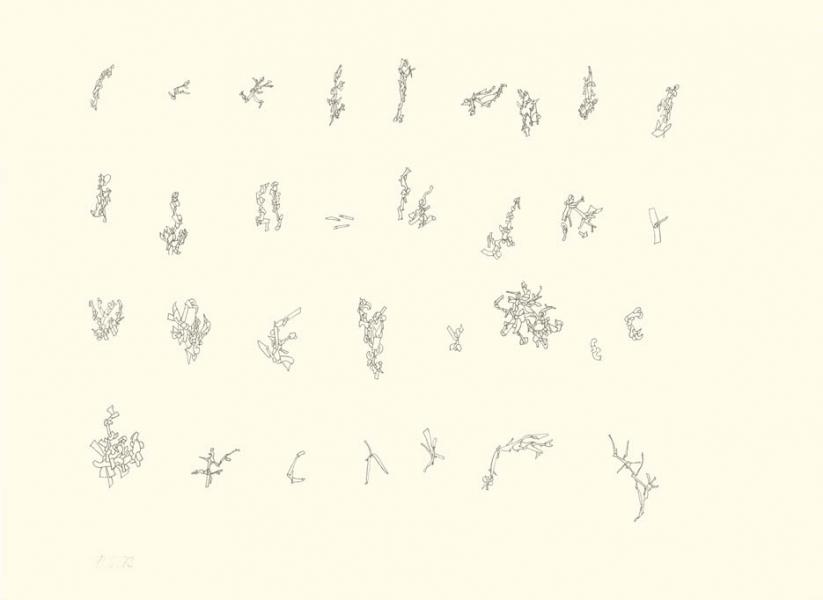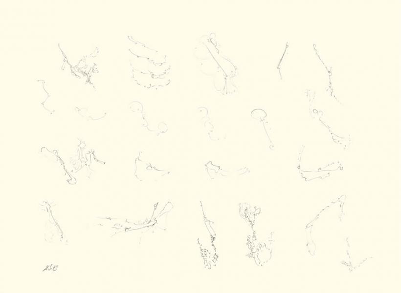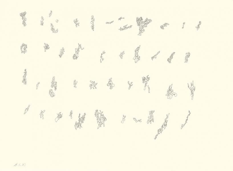 Die Knöchelchen-Zeichnungen waren meine ersten Bilder 1972/73. Sie waren einer Zergliederungsphase in meinen schriftlichen Arbeiten gefolgt an einem Punkt, wo die Schreibarbeit an die Knöchelchen stieß.