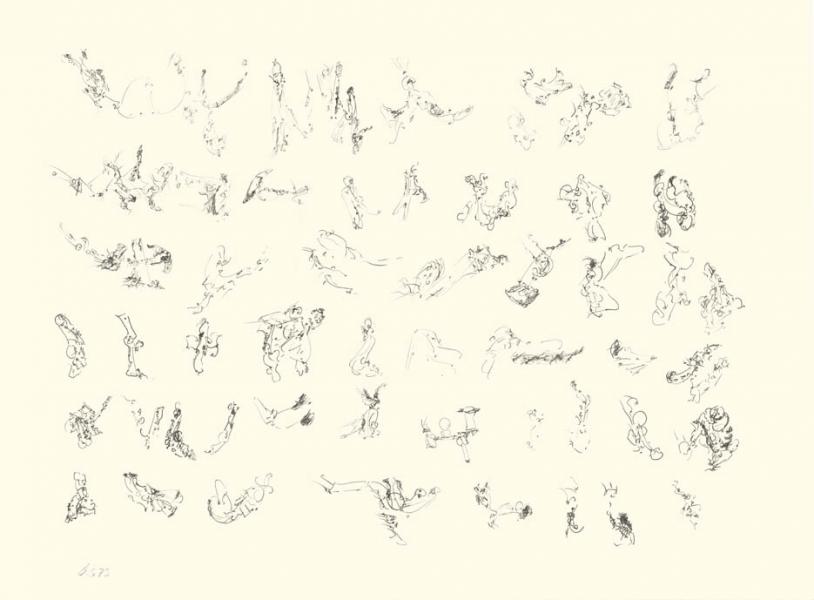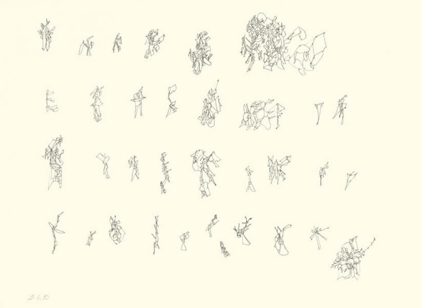 aus: Dominik Steiger, ÜBER MEINE KNÖCHELCHEN-ZEICHNUNGEN; erstveröffentlicht in: Otto Breicha (Hg.), Protokolle ’82/3. Zeitschrift für Literatur und Kunst, Bd. 3, Jg. 1982, Jugend und Volk, Wien/München 1982, S. 221