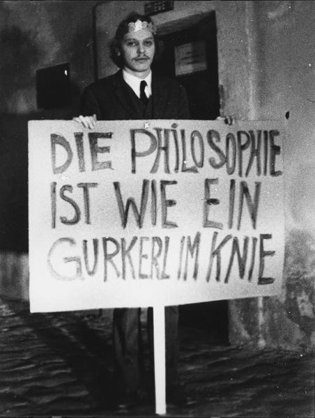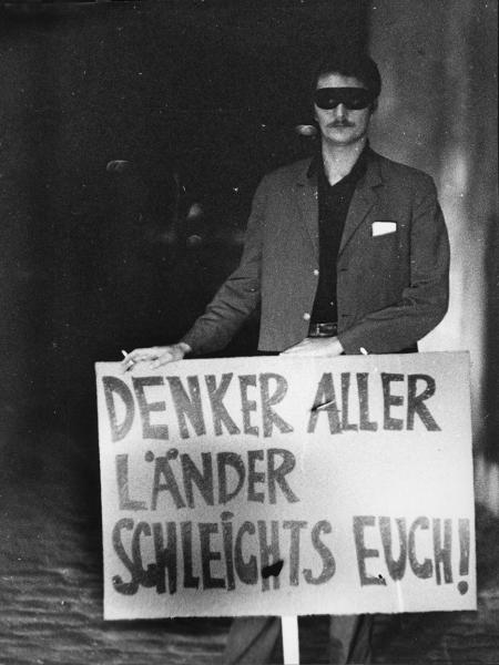 So hat er an dem Kollektivprojekt der großen sozialistischen Oktoberrevolution 1917 zwar nicht teilnehmen können, aber hat sie im Revolutionsjahr 1968 in einer Publikation verbessert, indem er ihre repressiven Elemente durch kindliche Phantasmagorien überwunden hat, z. B. „Malewitsch drehte das Licht ab und legte sich auf sein Bett. Die Zimmermöbel wurden finster, Malewitsch machte die Augen zu ud [sic] atmetet durch die Nase. Er lag auf dem Bett in seinem möblierten Kopf. Das Licht am Plafond ging an, wo das Hirn ist. Malewitsch lag rauchend auf seiner Zunge. […] Er durchquerte das Zimmer, schob die Vorhänge zur Seite und trat hinter seine Netzhaut“.2 Neben seiner großen literarischen Produktivität beherrschten in den 1960er Jahren vor allem aktionistische Kollaborationen das Feld seiner Kreativität.