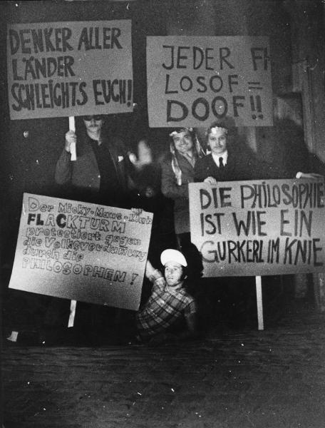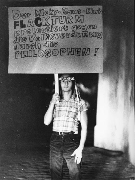 Im August 1968 haben Steiger, Reinhard Priessnitz und Co. einen Micky-Maus-Klub mit dem Namen Flakturm gegründet, weil Steiger im 3. Bezirk am Dannebergplatz in unmittelbarer Nachbarschaft zu einem berühmten Flakturmpaar wohnte. Die erste Aktion des Klubs fand Anfang September anlässlich des Internationalen Philosophen- Kongresses in Wien statt. Sie ließen sich mit Protesttafeln fotografieren, auf denen die Philosophie in Kindersprache attackiert wurde, z. B. „Denker aller Länder schleichts Euch!“, „Jeder Filosof = doof!!“, „Die Philosophie ist wie ein Gurkerl im Knie“. In den 1960er Jahren liefen die aktionistischen Kollaborationen mehr oder minder aus.
