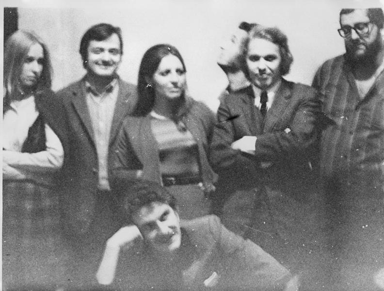 Wir nicht, 1968. V. li. n. re.: Walter Pichler, Ernst Graf, Ingrid Schuppan, Oswald Wiener, Christian Ludwig Attersee, Kurt Kalb und Dominik Steiger. Sujet für ein Ausstellungsplakat, stehende Version. S/W-Fotografie.