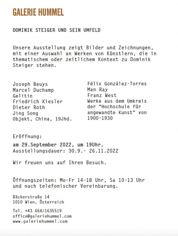 Dominik Steiger (1940 Wien – 2014 ebenda) ist ein österreichischer Literat und Künstler aus dem Umfeld der Wiener Gruppe und des Wiener Aktionismus. Er gilt seit den 1960er-Jahren als wichtiger Vertreter der österreichischen Postavantgarde und als Grenzgänger zwischen den künstlerischen Genres. Über fünfhundert ausgestellte Exponate aus mehr als fünf Jahrzehnten zeugen von Steigers überbordender Kreativität. Sie umfassen neben Zeichnungen, Aquarellen, Collagen und Fotografien eine Vielzahl von Audio-, Video- und Objektarbeiten. Mit Künstlerkollegen wie Christian Ludwig Attersee, Hermann Nitsch, Dieter Roth, Arnulf Rainer und Günter Brus entwickelt er in den 1970er- und 1980er-Jahren zahlreiche Gemeinschaftsarbeiten. Ab 1975 ist er regelmäßig in Solo- und Gemeinschaftsausstellungen vertreten, u. a. in Wien, Frankfurt, Brüssel, Helsinki, Madrid, Pécs, Wels, Köln, Graz, Salzburg, Lübeck, Mürzzuschlag und Zürich. 2004 gewinnt er den österreichischen Literaturpreis, 2008 den Preis für bildende Kunst der Stadt Wien.