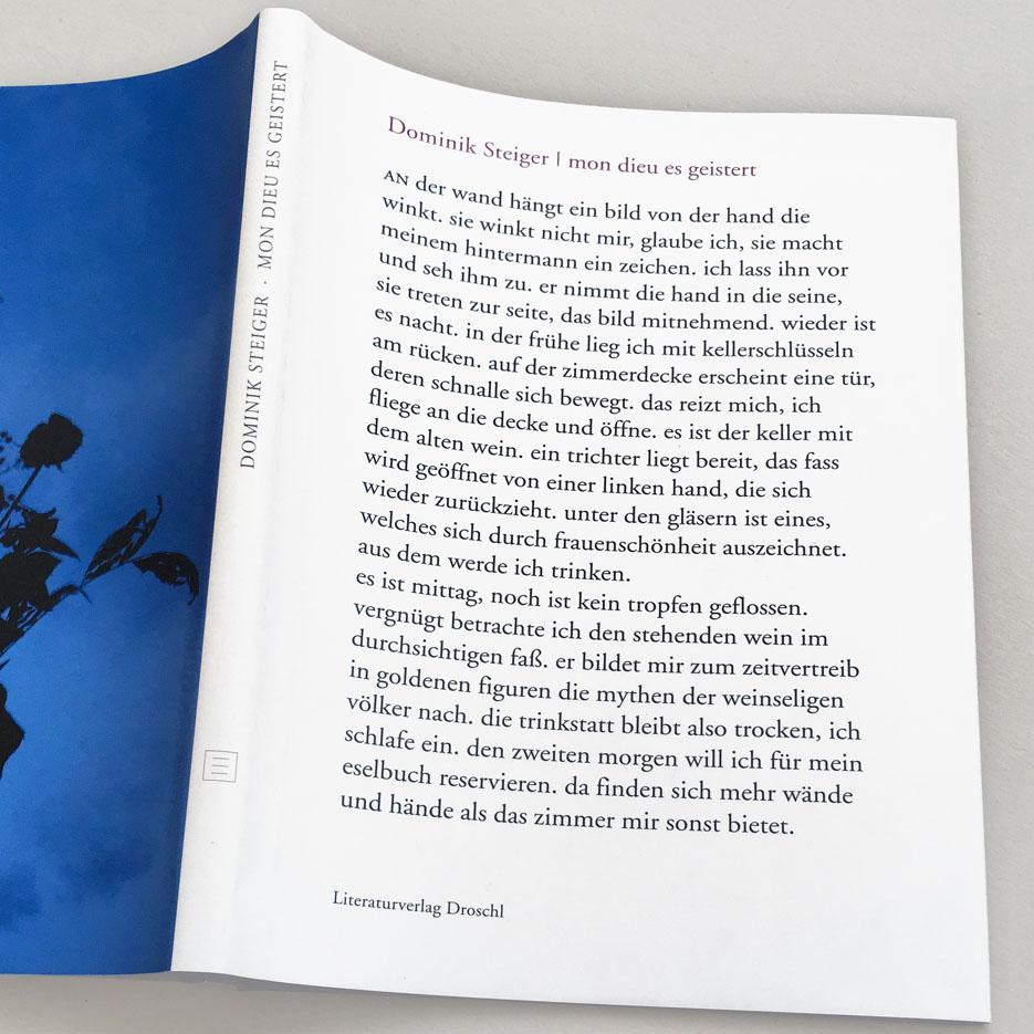 Textauszüge aus: Dominik Steiger, mon dieu es geistert, Literaturverlag Droschl, Graz/Wien, 2007, http://www.droschl.com/autor/dominik-steiger/