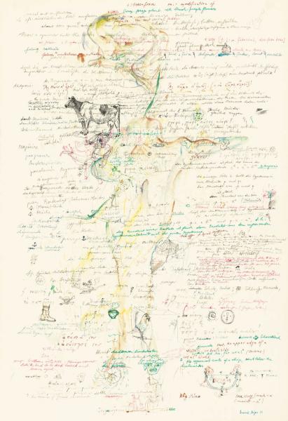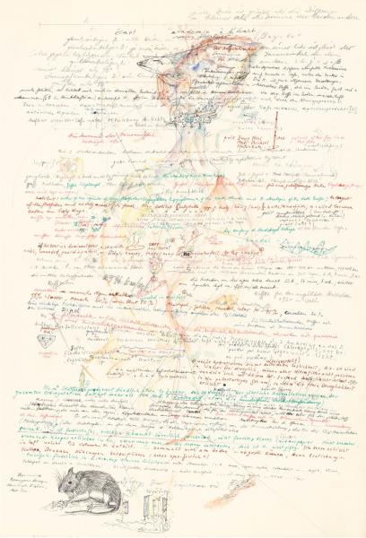 (…) In the so-called Exzerptmarterln from 1980, the sheet of paper is both a drawing ground and a writing surface. Once again it becomes evident that Steiger was not only a drawing scribe, but also a reading draftsman. In an almost manic manner, he transcribed or excerpted what he had read, gathered individual pieces information from various fields of knowledge, which suggest order and logic through their meticulous and precise transcription. (...) Written words as a semantic carrier of meaning turn over and leave the text oscillating in content between a just-yet and a not-more. Even if a thought flashes here and there, or an animal lifts its eyes out of the thicket, the reception of distinct signs and the recognition of contexts of meaning seem reserved for the author alone. For everyone else, Steiger's excerpts turn into torture - or into senseless pleasure beyond a clear reading..(…)